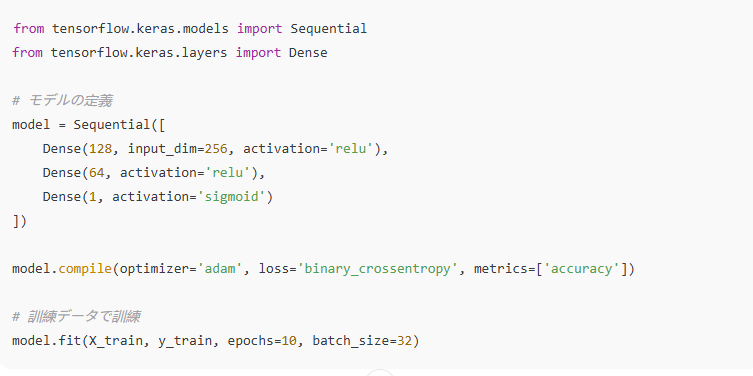 Keras や TensorFlow を使って、名刺情報を抽出するためのニューラルネットワークを訓練します。以下は、簡単なニューラルネットワークの構築例です。