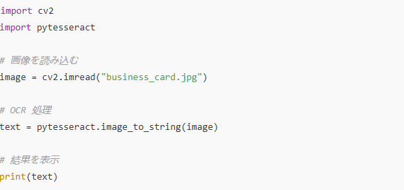 これにより、名刺画像から抽出されたテキストが表示されます。画像の品質や文字の配置に応じて、精度が変動するため、後のステップで画像の前処理を行うことが重要です。