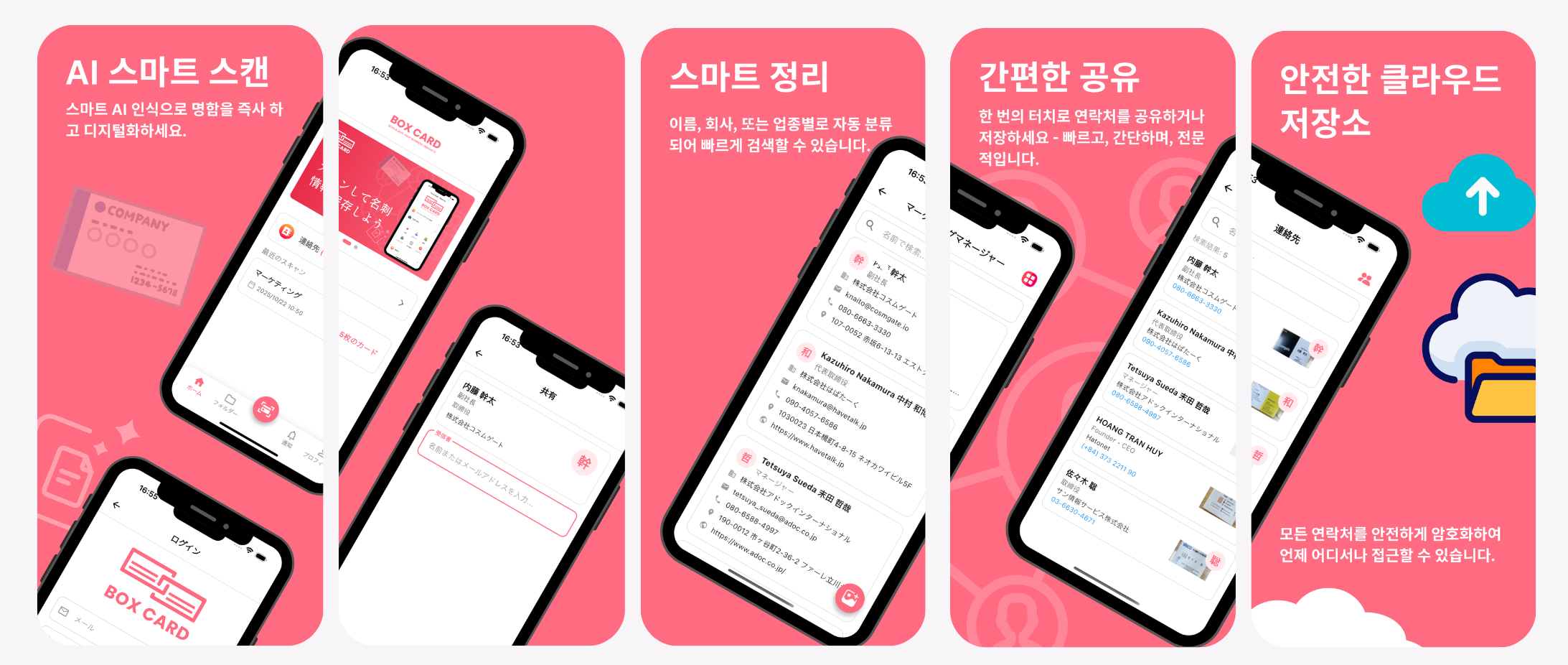 ・ 부드러운 조작 경험: 복잡한 설정이나 불필요한 기능 없이 누구나 직관적으로 사용 가능합니다.・ 경량 및 고속: 무겁고 실행에 시간이 걸리는 앱과 달리 쾌적한 스캔, 정리, 검색이 가능합니다.・ 무료로 필요한 기능 커버: 명함 판독, 정리, 검색, 공유 등 기본 기능은 모두 무료입니다.즉, 「필요한 기능만 쾌적하게, 무료로」 제공한다는 점에서 BoxCard는 다른 앱과 차별화됩니다. 특히 다국어 명함이나 해외 거래가 많은 비즈니스에서는 그 편리함이 돋보입니다.